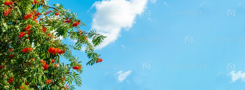 Ветви рябины с красными ягодами фон знамя голубого неба. Осень и естественный фон. Осеннее знамя с ягодами и листьями рябины. Скопируйте пространство
