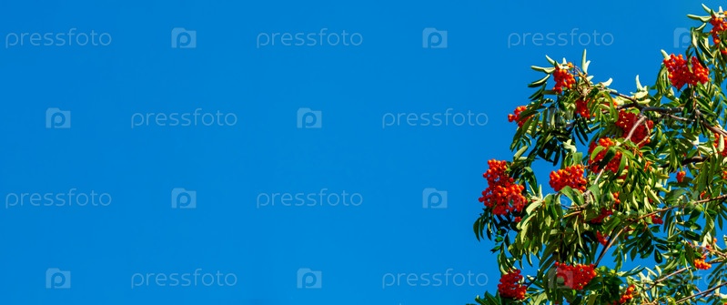 Ветви рябины с красными ягодами фон знамя голубого неба. Осень и естественный фон. Осеннее знамя с ягодами и листьями рябины. Скопируйте пространство