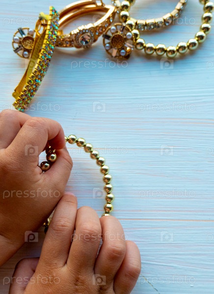 Детские руки играют с золотыми украшениями и бижутерией, на белом фоне. концепция женского счастья