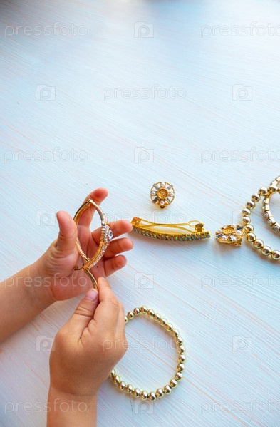 Детские руки играют с золотыми украшениями и бижутерией, на белом фоне. концепция женского счастья