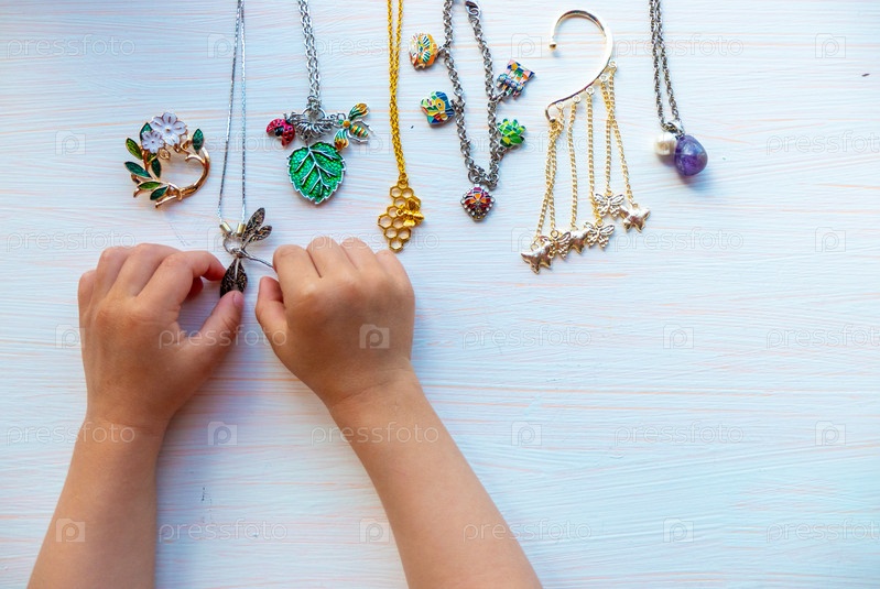 Детские руки играют с легкой летней бижутерией, на белом фоне. концепция женского счастья