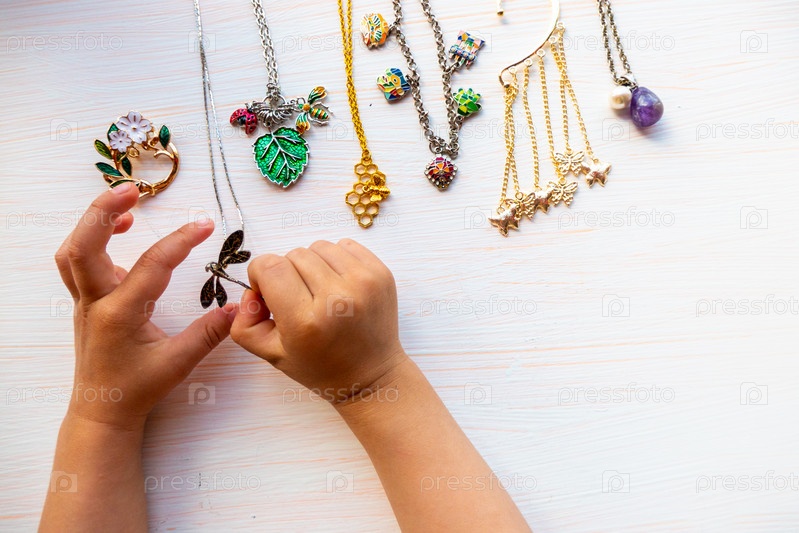 Детские руки играют с легкой летней бижутерией, на белом фоне. концепция женского счастья