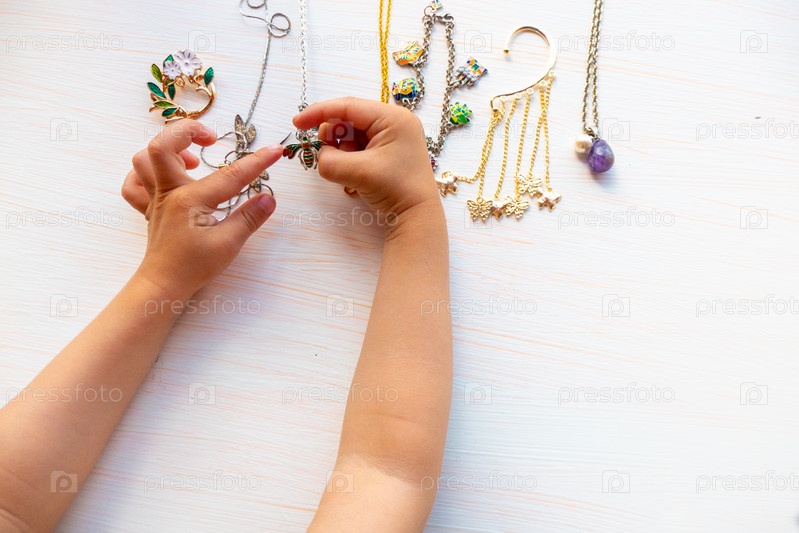 Детские руки играют с легкой летней бижутерией, на белом фоне. концепция женского счастья