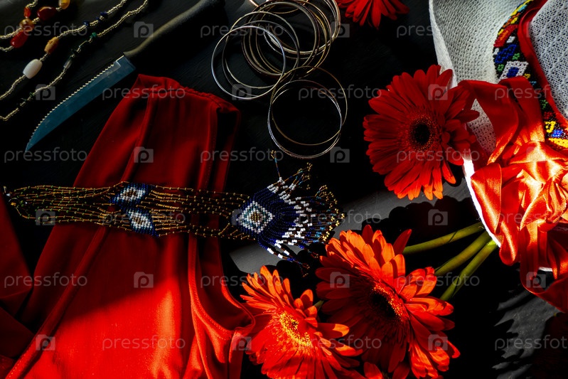 Набор красных, белых и красочных модных аксессуаров на черном фоне