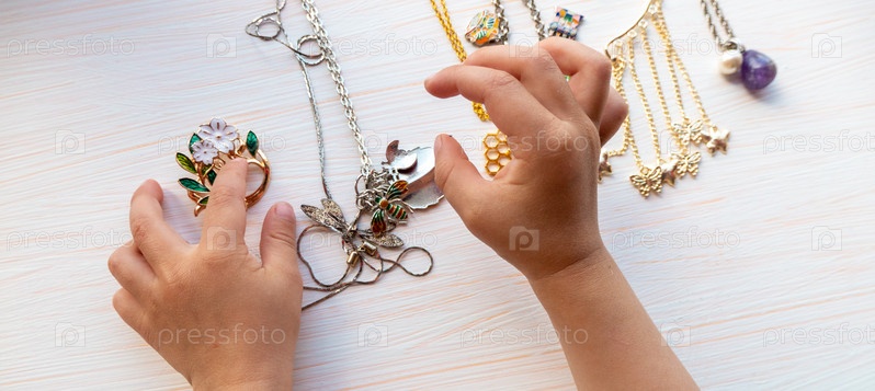 Детские руки играют с легкой летней бижутерией, на белом фоне. концепция женского счастья