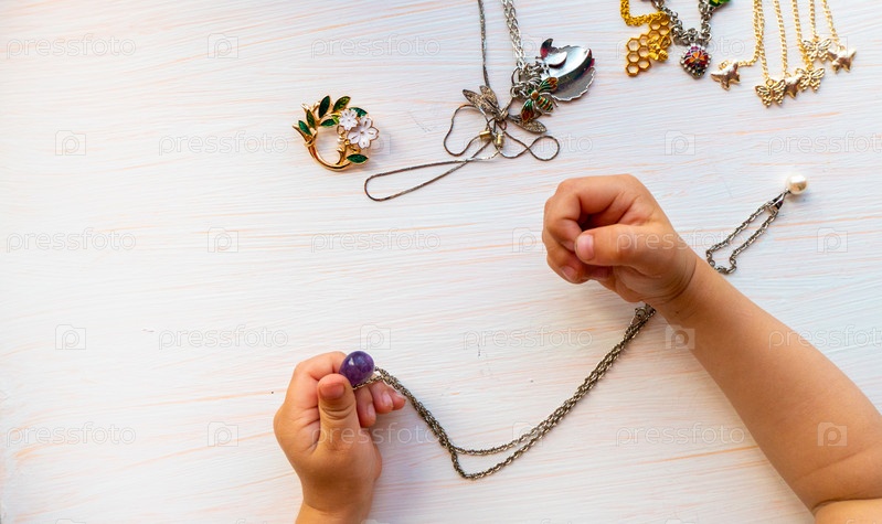 Детские руки играют с легкой летней бижутерией, на белом фоне. концепция женского счастья