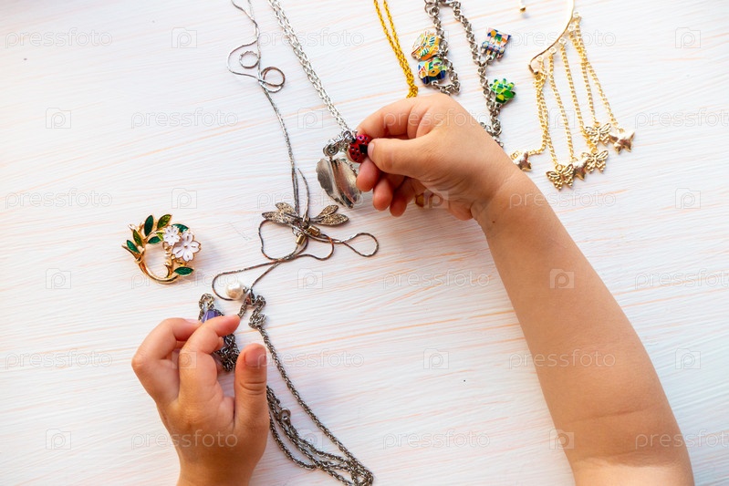 Детские руки играют с легкой летней бижутерией, на белом фоне. концепция женского счастья