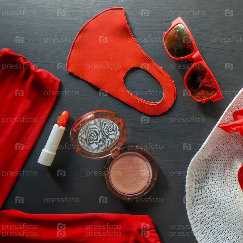 Набор красных и белых модных аксессуаров на черном фоне