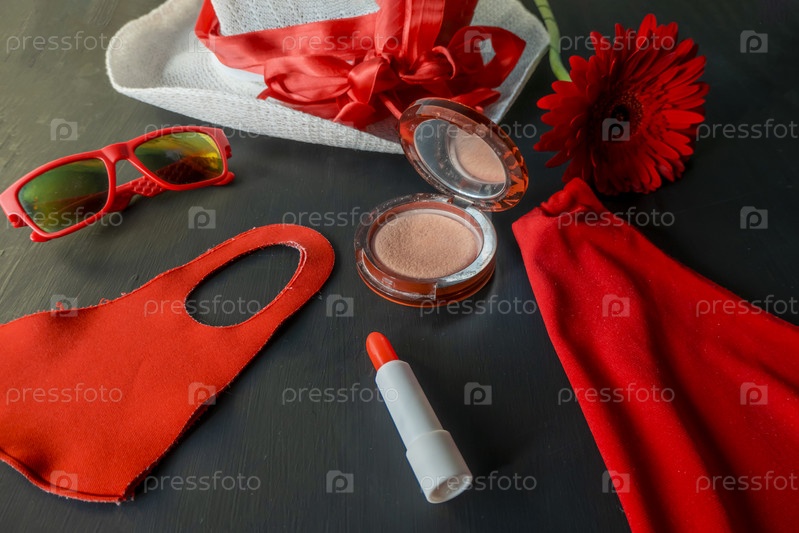 Набор красных и белых модных аксессуаров на черном фоне