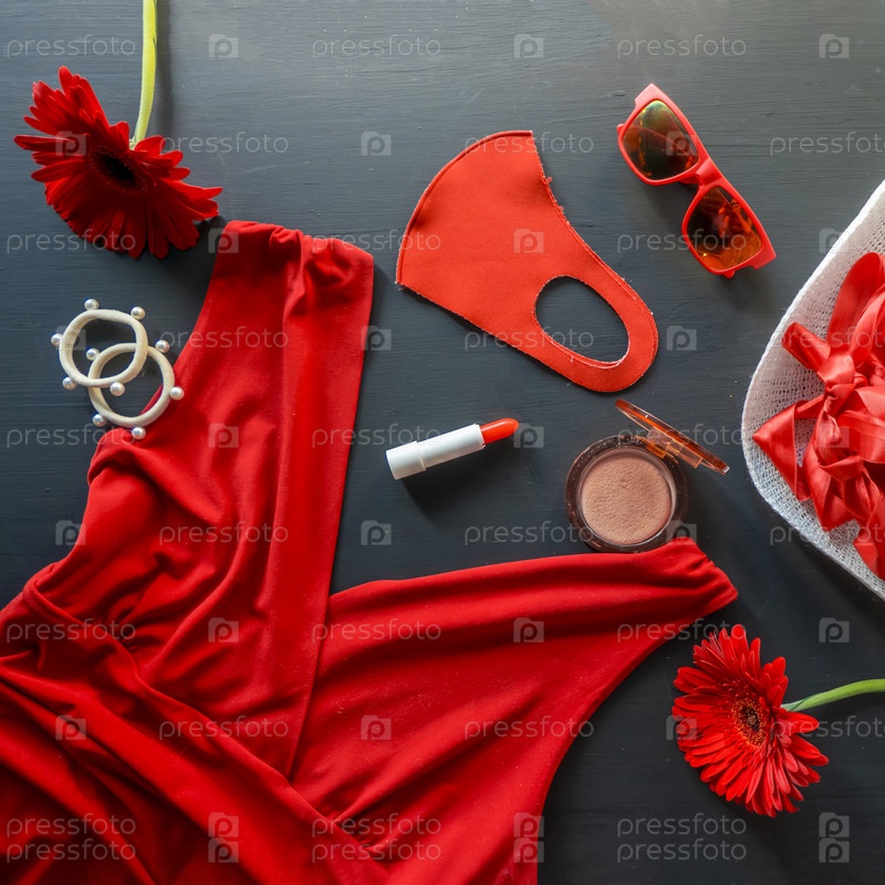 Набор красных и белых модных аксессуаров на черном фоне