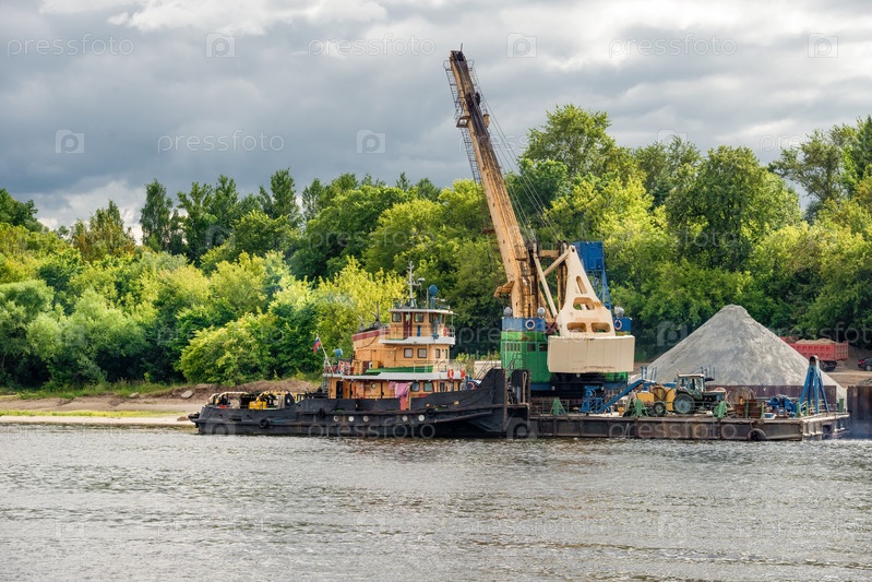 Кран и баржа для песка на берегу Волги в весенний пасмурный день