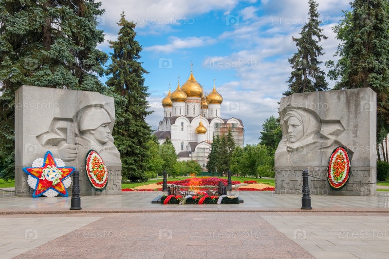 Ярославль, Россия - 14 августа 2020 г.: Мемориал Вечный огонь и Успенский собор ночью. золотое кольцо России