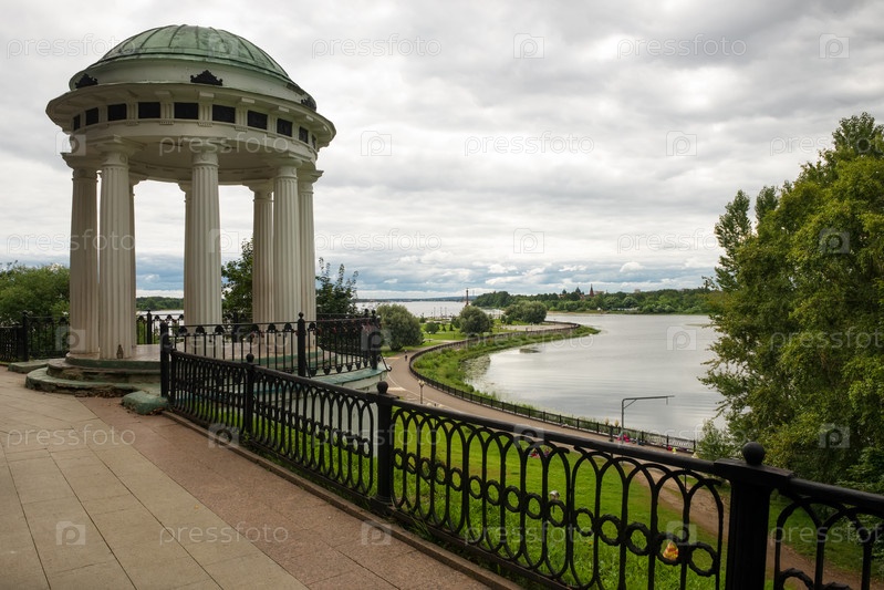 Ротонда на Которосльной набережной в Ярославле. Вид на стрелку - место слияния Волги и Которосла, Ярославль. Золотое кольцо России