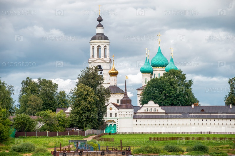 Вид на Толгский монастырь. Святые врата с Никольской церковью, собор Введения во храм Пресвятой Богородицы, колокольня. Вид с Волги. Ярославль, Россия