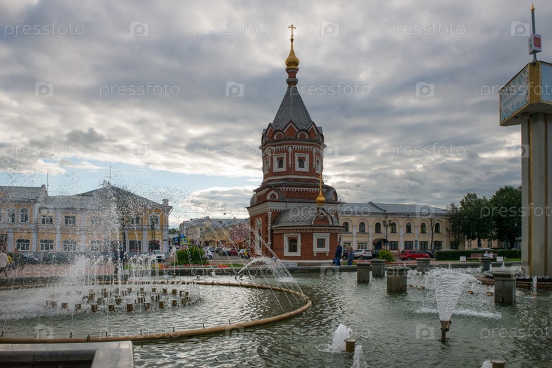 Вечерний вид на фонтан перед часовней Александра Невского в Ярославле, Россия