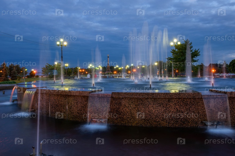 Ночной вид на поющие фонтаны в парке Стрелка в Ярославле, Россия