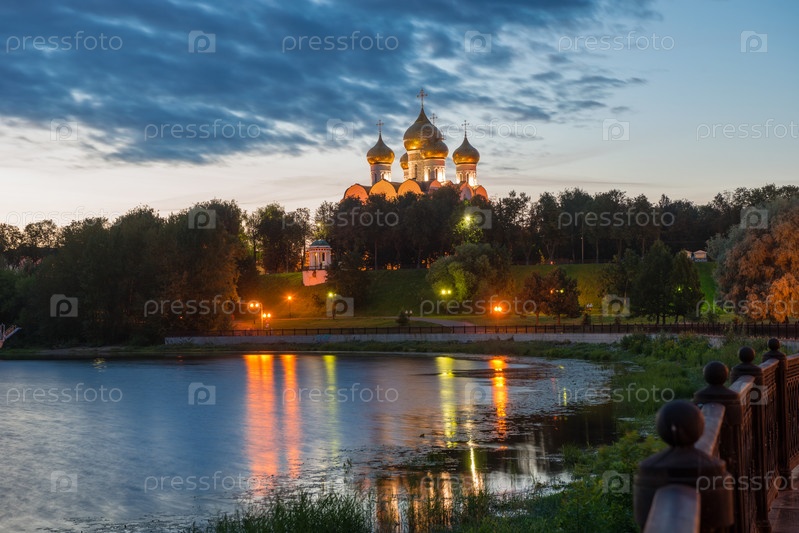 Ночной вид на собор Успения Пресвятой Богородицы из парка Стрелка в городе Ярославль, Россия