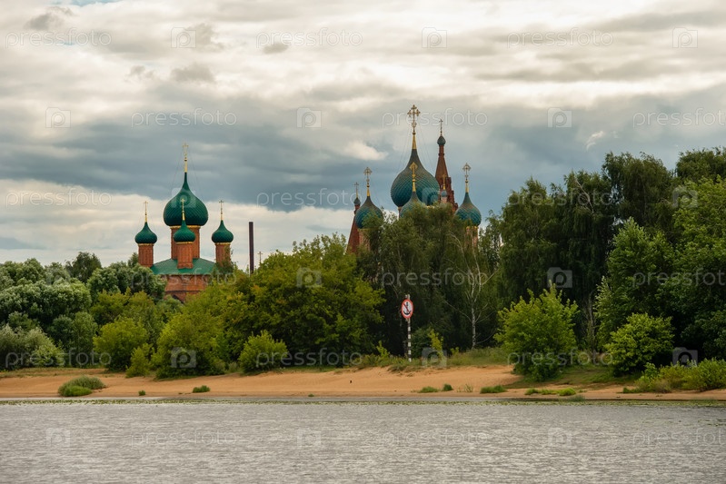Ярославль, Россия - 14 августа 2020 г.: Вид на Храмовый комплекс в Коровниках, у слияния рек Волги и Которосля. Ярославль входит в Золотое кольцо России