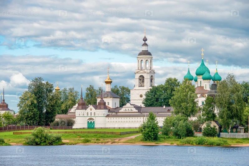 Вид на Толгский монастырь. Святые врата с Никольской церковью, собор Введения во храм Пресвятой Богородицы, колокольня. Вид с Волги. Ярославль, Россия