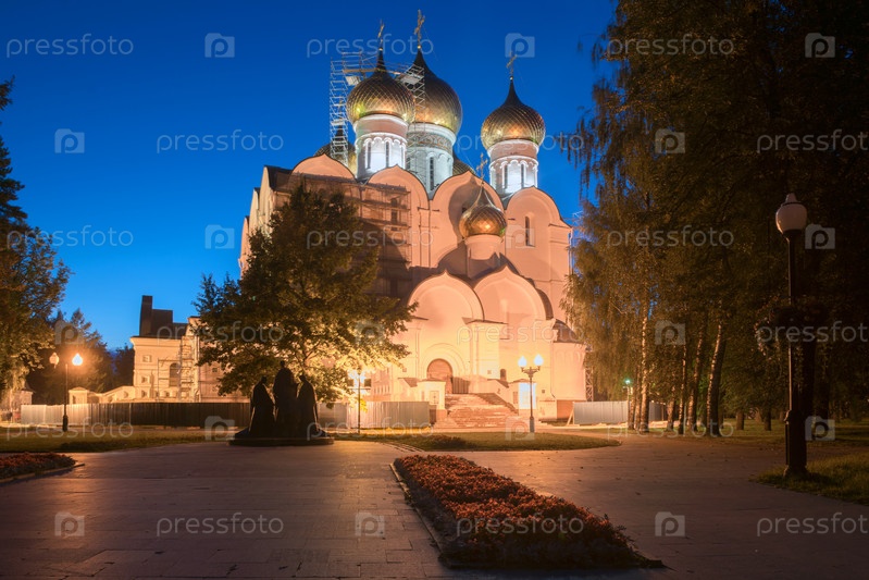 Ярославль, Россия - 14 августа 2020 г.: Ночной вид на Успенский собор Пресвятой Богородицы и скульптуру "Святая Троица"