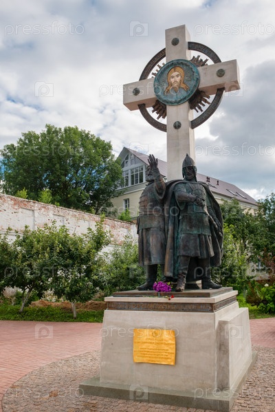 Ярославль, Россия - 14 августа 2020 г.: Памятник руководителям народного ополчения 1612 года Кузьме Минину и князю Дмитрию Пожарскому в Кирилло-Афанасьевском монастыре. Ярославль, Золотое кольцо России