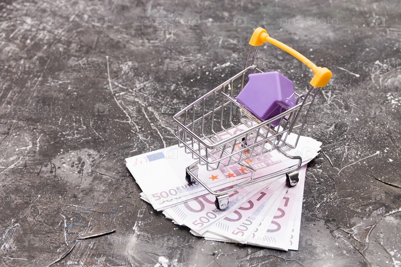 Маленький игрушечный домик в тележке для покупок, купюры 500 евро, черный текстурированный фон, пространство для копирования, покупка концепции недвижимости