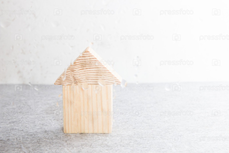 Игрушечный деревянный дом за мокрым стеклом, защита дома, концепция страхования недвижимости