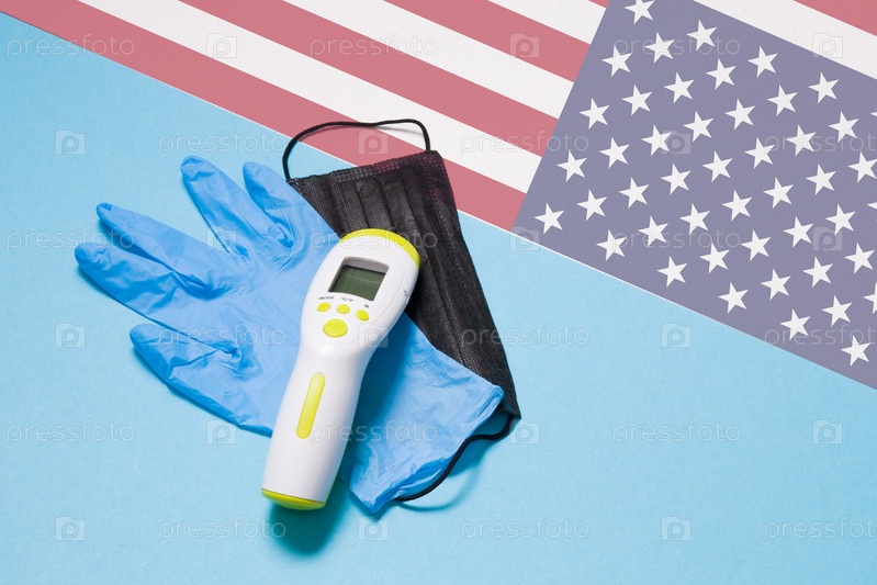 Синяя одноразовая медицинская перчатка, черная маска для лица, инфракрасный термометр для бесконтактного измерения температуры на флаге сша и синем фоне, пространство для копирования