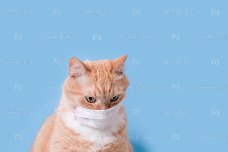 Милый испуганный рыжий кот в белой детской медицинской защитной маске на синем фоне копировального пространства, концепция защиты от вирусов и бактерий, ветеринария и лечение домашних животных