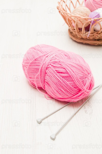 Моток розовых ниток с блестками, спицы, серый фон, корзинка с нитками