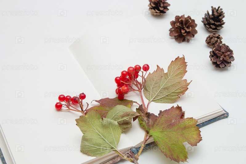 Ветка с красными ягодами калины на открытой тетради с толстыми листьями на белом фоне копией пространства вид сверху место для текста начало осени