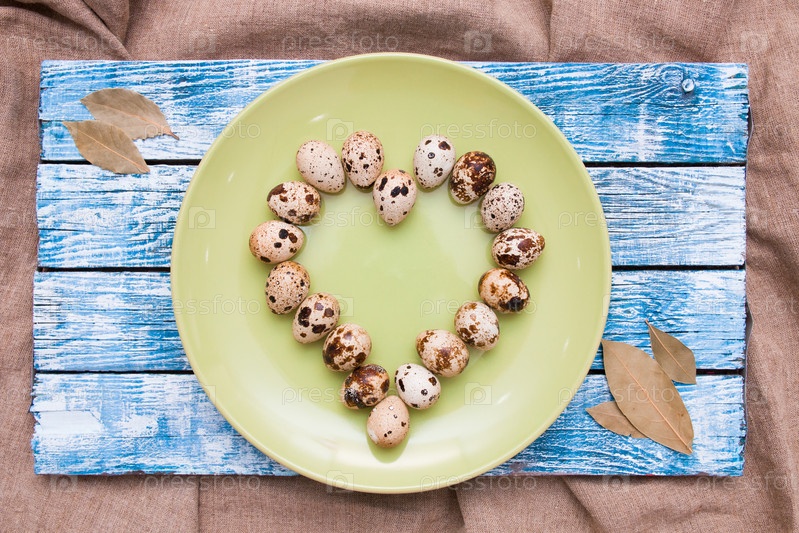 Перепелиные яйца, выложенные в форме сердца на зеленой тарелке, пасхальный фон, синий деревянный поднос, лавровый лист, льняная ткань, копия пространства