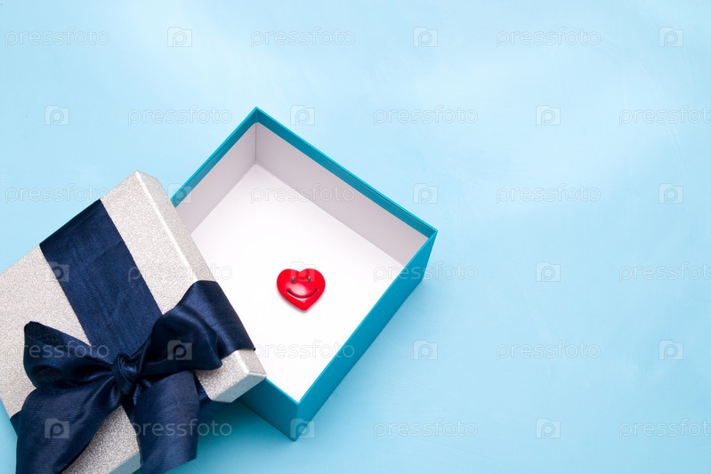 Фигурка красного сердца с улыбкой в подарочной коробке с большим темно-синим бантом из атласной ленты, белая коробка внутри, синий фон, пространство для копирования