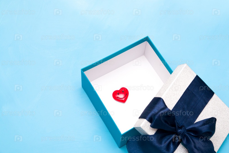 Фигурка красного сердца с улыбкой в подарочной коробке с большим темно-синим бантом из атласной ленты, белая коробка внутри, синий фон, пространство для копирования