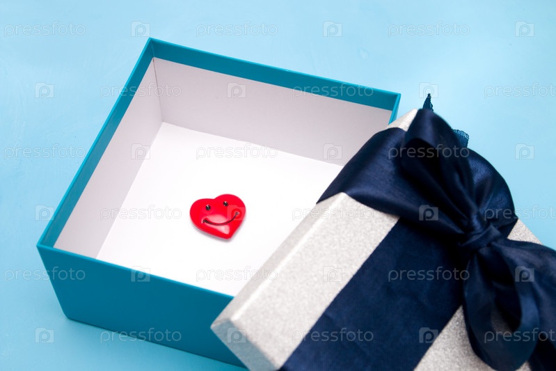 Маленькое улыбающееся сердце в подарочной коробке, темно-синий бант из ленты, белая внутри и синяя снаружи коробка, люблю дарить, синий фон, крупный план