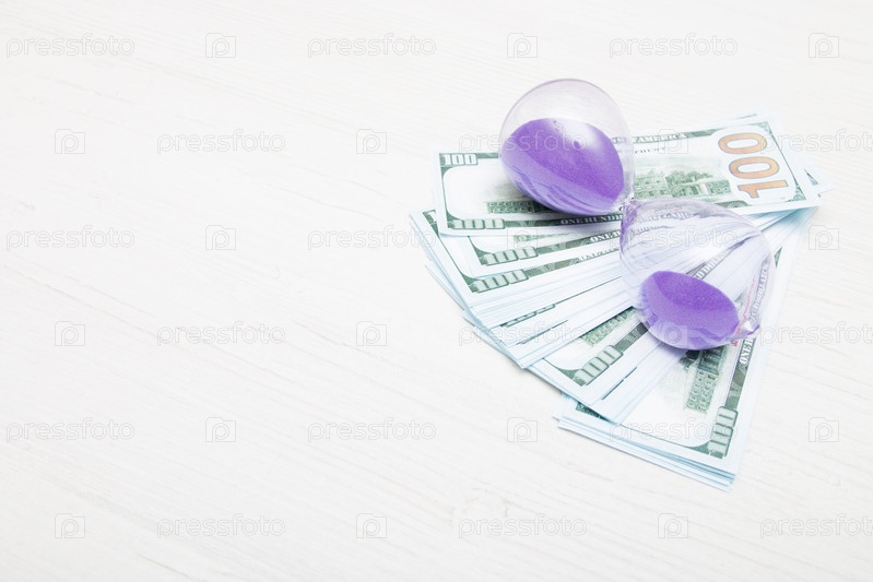Стопка 100-долларовых купюр и песочные часы на светлом фоне копировального пространства
