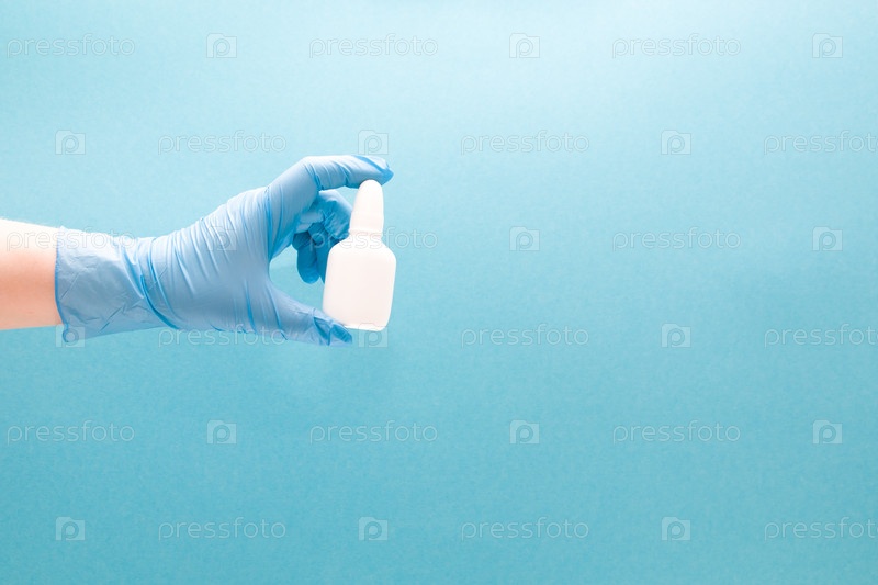 Женская рука в синей одноразовой медицинской перчатке держит белую пластиковую бутылку с каплями для носа, пространство для копирования на синем фоне, капли для носа, лекарство для носа