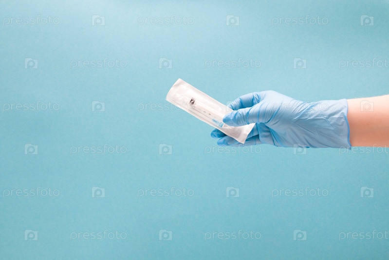Женская рука в синей одноразовой медицинской перчатке держит одноразовый шприц в упаковке, пространство для копирования на синем фоне