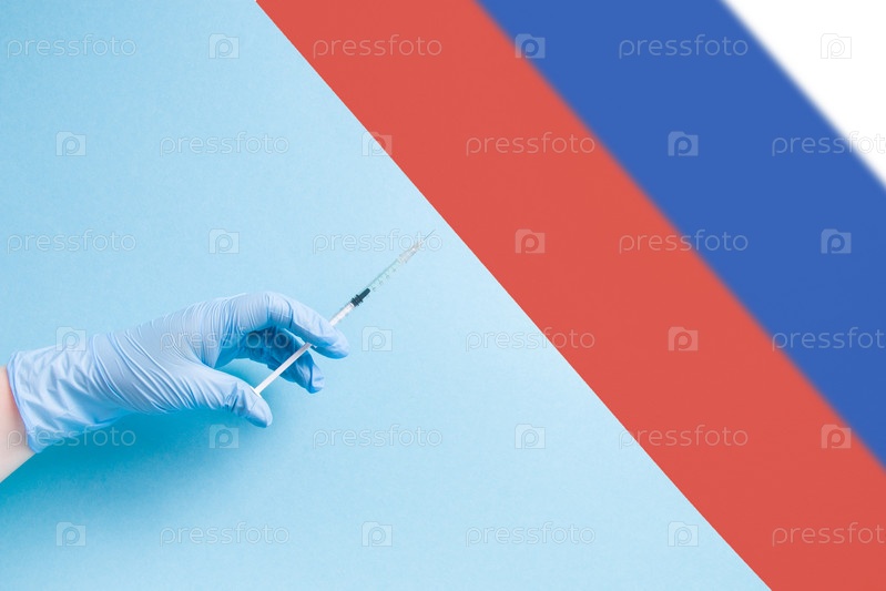 Рука в синей одноразовой резиновой перчатке держит инсулиновый шприц с инъекцией на синем фоне, копирует пространство на белом фоне
