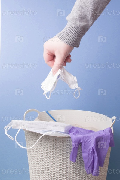 Мужчина выбрасывает использованную защитную маску синего цвета в мусорное ведро, синий фон, пространство для копирования, женская рука держит детскую маску над мусорным баком