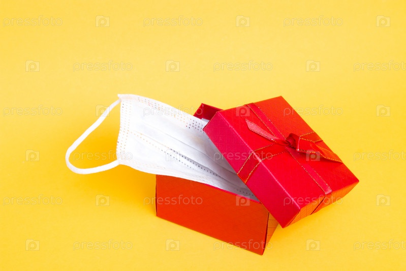 Белая защитная медицинская детская маска в красной подарочной коробке с бантом на желтом фоне копией пространства, праздник в карантинной концепции