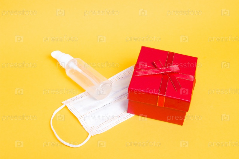 Белая защитная медицинская детская маска и гель-антисептик рядом с красной подарочной коробкой с бантом на желтом фоне копией пространства, праздник в карантинной концепции