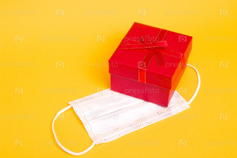 Белая защитная медицинская маска для детей и красная подарочная коробка с бантом на желтом фоне копией пространства, праздник в карантинной концепции