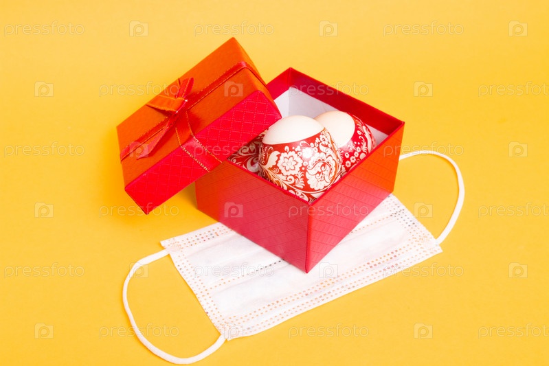 Белая защитная медицинская детская маска и пасхальные яйца в красной подарочной коробке с бантом на желтом фоне копией пространства, праздник в карантинной концепции