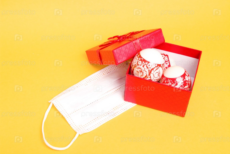 Белая защитная медицинская детская маска и пасхальные яйца в красной подарочной коробке с бантом на желтом фоне копией пространства, праздник в карантинной концепции