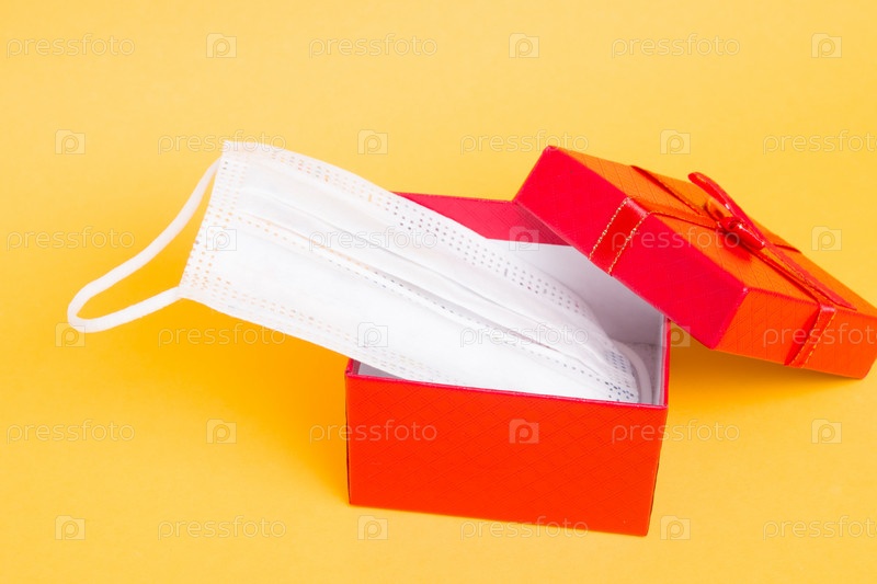Белая защитная медицинская детская маска и пасхальные яйца в красной подарочной коробке с бантом на желтом фоне копией пространства, праздник в карантинной концепции