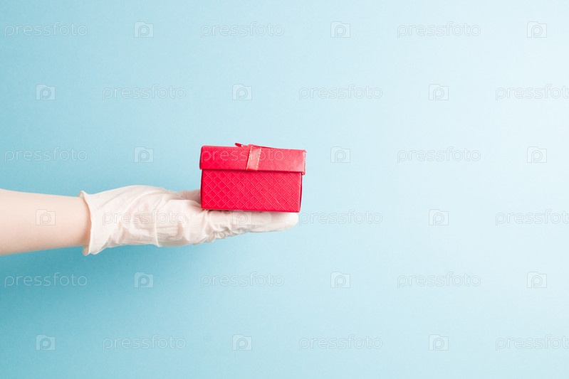 Рука в синей одноразовой перчатке держит красную подарочную коробку с бантом из красной ленты с золотой нитью, светло-голубой фон, пространство для копирования