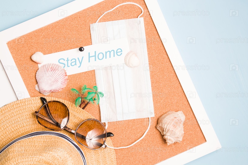 Соломенная шляпа, медицинская маска для лица, пальма, солнцезащитные очки и ракушки на пробковой доске, надпись оставайся дома, синий фон, концепция путешествий и карантина