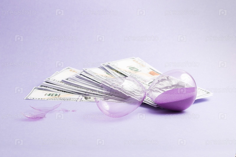 Сломанные песочные часы с фиолетовым песком и стопка стодолларовых купюр на синем фоне, пространство для копирования, концепция кризисного мира