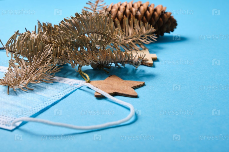 Рождественские украшения еловые ветки, еловые шишки и медицинская защитная маска и на синем фоне, концепция 2021 года